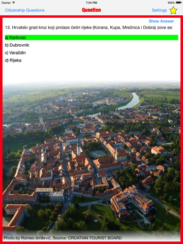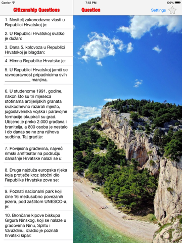 The 100 possible questions are included in the app with the answers available by in-app purchase. Questions flashcards can be scrolled manually or automatically, with or without answers. Starred questions are added to a separate list which can be used to study specific questions. A "Questions To Practice" list tracks questions which have been answered incorrectly. Beautiful photos of Croatia, used by permission of the Croatian Tourist Board, are included in the iPad version.
