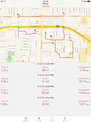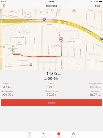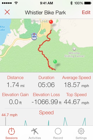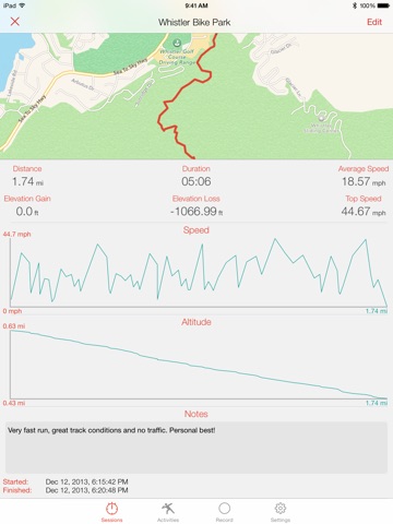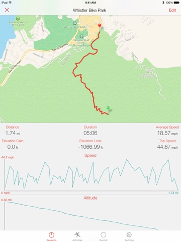 Sessions record the exact path, elapsed time, traveled distance, average and top speed, elevation gain and elevation loss. Your current speed, altitude and current location will also be displayed both on your iOS device and optionally on your Apple Watch!