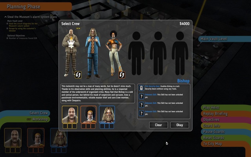 - Customize your gang of thieves choosing from a variety of playable characters. The powerful bruiser makes a good hatchet man, while the locksmith is responsible for the finishing touches.