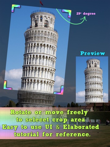 √ Rotate crop area by arbitrary angle(7°,29°,41°,62°,127°,279°, or any other angle) and crop the photo. NO CROPPING APP gives this feature. All other apps gives just 90° rotation feature. The only app that supports arbitrary angle of rotation and crop the photo.