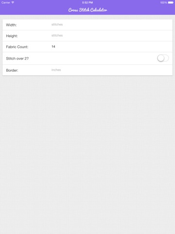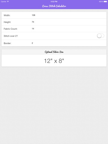 Worried about purchasing the wrong sized fabric for your cross stitch projects? This essential app for xstitch enthusiasts takes away the guess work! Quickly calculate the size of fabric required. Enter the stitch count, fabric type and (optional) border size and watch as the optimal fabric size is instantly updated. Includes support for stitching over two threads.