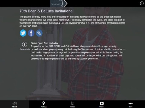 Leaderboard, parking, events around the course, social media feeds, Tickets, exclusive deals and more.
