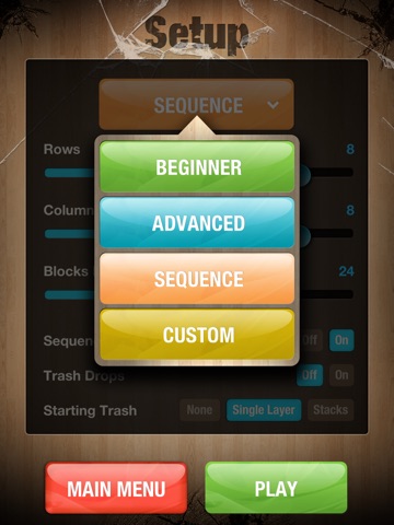 Custom allows you to set the game board size from 3x3 up to 9x9 including uneven board sizes like 3x9 and you can specify all the other game rules including starting trash, trash drops on/off and sequence mode on/off.