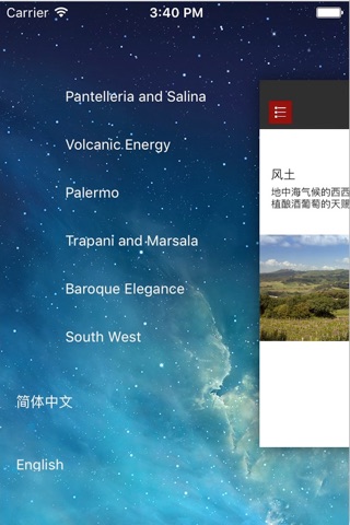 本应用的内容可以采用中、英文两种阅读模式。应用按照葡萄酒分类、葡萄品种及产地三个维度介绍了西西里岛盛产的葡萄酒,同时介绍了因为西西里岛独特的地理位置所带来的各种葡萄和葡萄酒的特点。