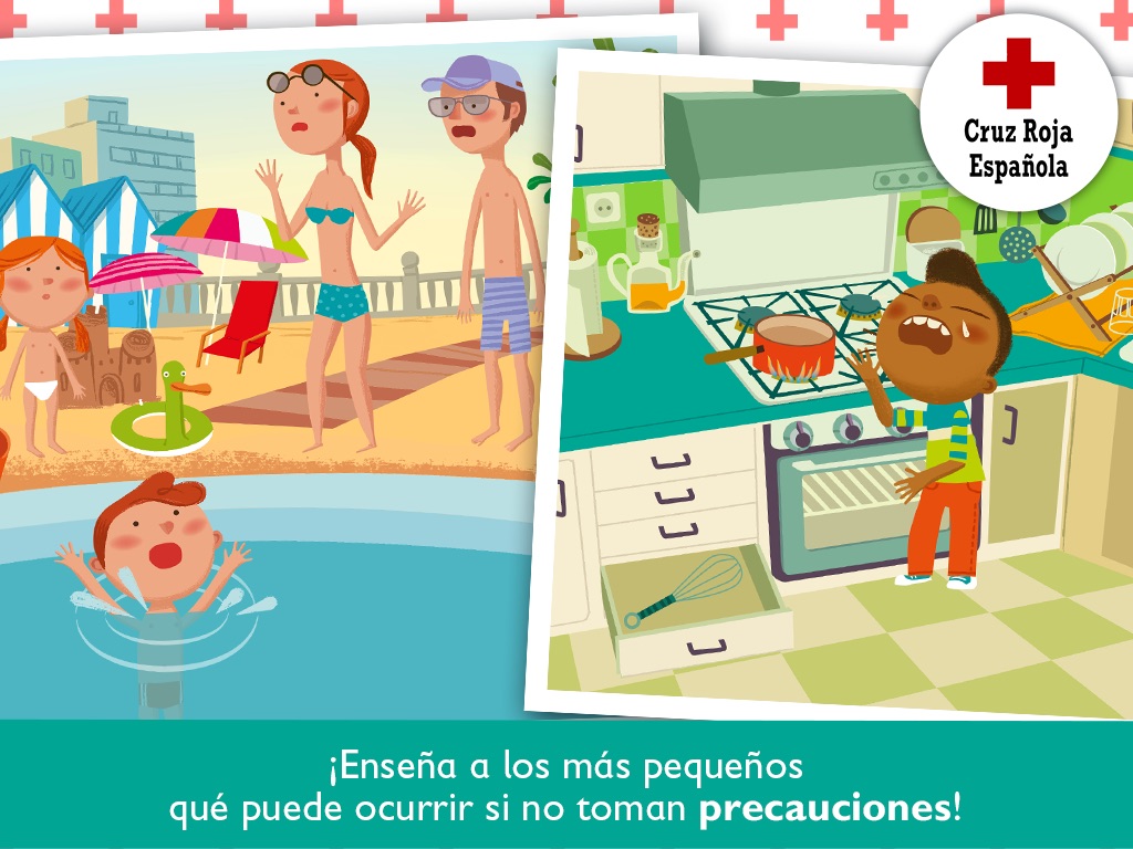 Boys and girls can act out each simulation however they like and see the consequences of their actions. They will learn to take care to prevent falls, to avoid cuts and burns in the kitchen, to be prudent at the park and to recognize toxic products that may be found at home. They will also learn how to avoid traffic accidents, drowning at the beach or in pools, heat stroke and sunburn.