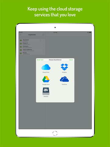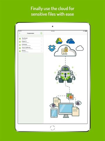 Cryptomator makes your cloud storage trustworthy. The app encrypts files on your mobile device before they are uploaded to your cloud. Even if a third party gained unauthorized access to your files (e.g., hacker attack), your files are secure from prying eyes.