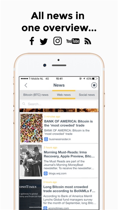 The chronological news feeds in the app are unique. Not only do we show the most popular news websites items, but also all important Twitter, Facebook, Instagram and Youtube messages. Everything in one app!