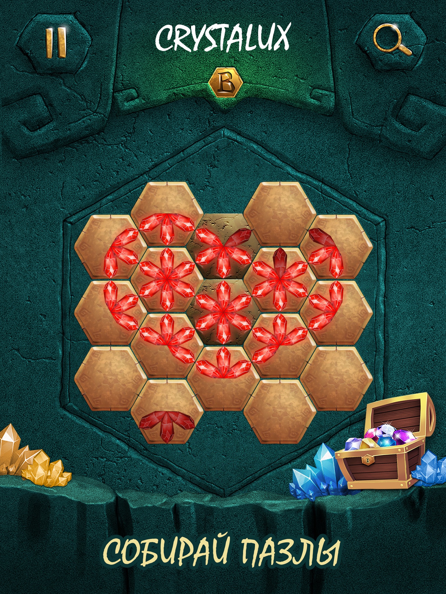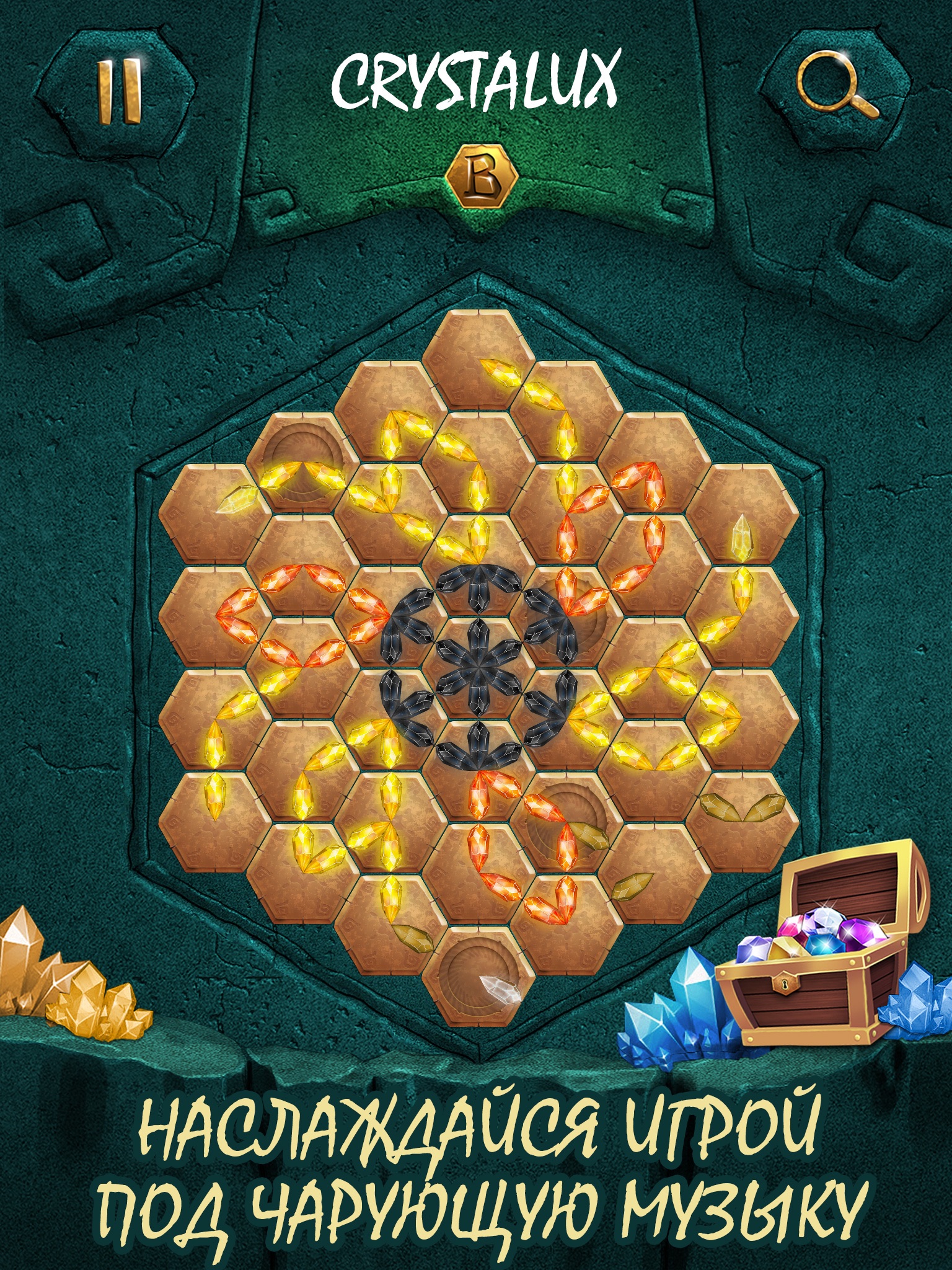 The gameplay is simple: just move six-sided pieces around and match crystals of the same color. To complete a level, use the crystals to form a pattern or picture. If things get tricky, there are hints that can help you. Just use them with any piece, and solving the most difficult pattern will become much easier.