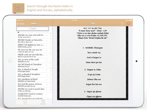 The App is a mobile Hymn based on the Cherubim and Seraphim Hymn Book – 2ND Edition. Available on iPhone, iPad & iPod Touch (sync’s across all platform when purchased on one); supports both English and Yoruba language. The App offers easy searching through hymns, categories, favourites, Index, social sharing, and more.