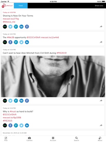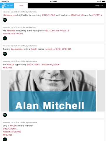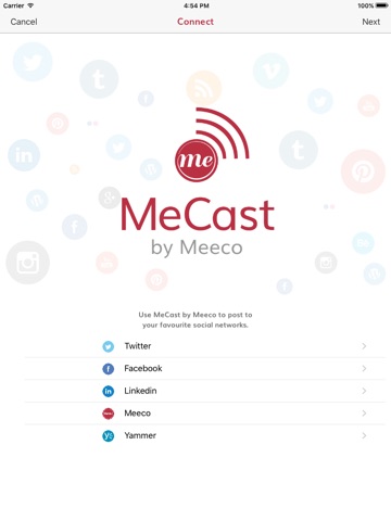 To set the PIE2015 release of MeCast, simply tap on the MeCast tab in the App and follow the prompts to connect your social accounts.