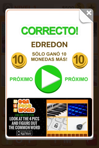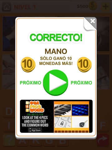Ganará monedas por cada respuesta correcta. Use las monedas para ayudarse en niveles más tardíos, para eliminar letras que no se usan o para revelar letras en la palabra.