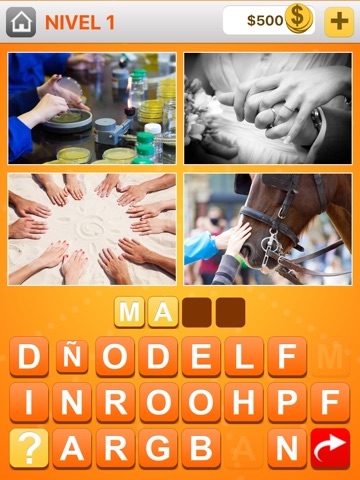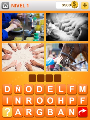 4 Fotos 1 Palabra es un juego de palabras basado en fotos. La meta es encontrar la palabra que todas las fotos tienen en común. Use las letras en el estante para deletrear la palabra. Hay bloques para indicar cuál es la longitud de la palabra secreta.