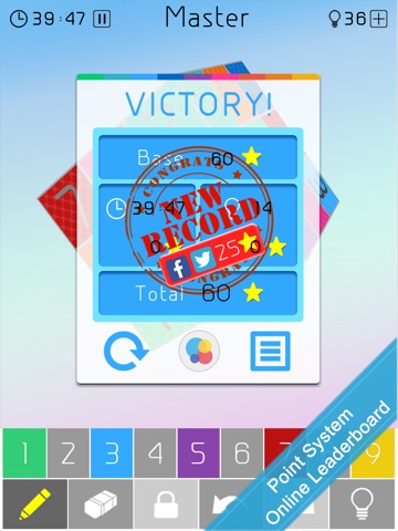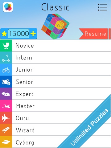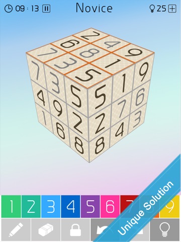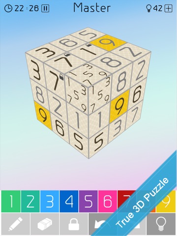 There are two playing modes: Classic and Twist. In the Twist mode, the added twist is that on two highlighted faces, numbers in each row and column must all add up to 15. Sound easy? Well, try solving a puzzle in the Cyborg level, where only three numbers are given at the beginning!