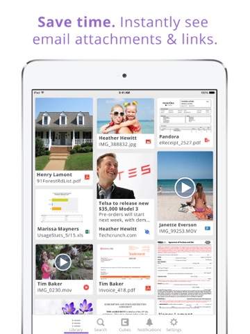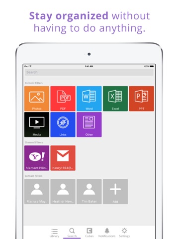 Save time. No more content silos, juggling between different services or scrolling through lists. With Cubes, everything’s in one place and one touch away - search by the file type (e.g. photos, PDFs, documents), people, interests or topics, or channels (e.g. Gmail, Outlook, Yahoo Mail, Dropbox).