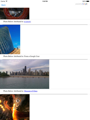 Touch a place pin for the name of the place and touch the caption view that appears to look at place details. Depending on availability, place details include, name, address, phone number, open now, placess web site, reviews and photos. Can show up to ten photos and five reviews.