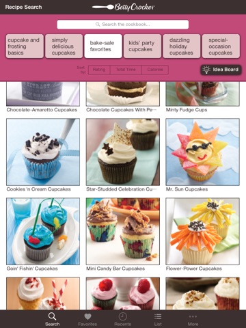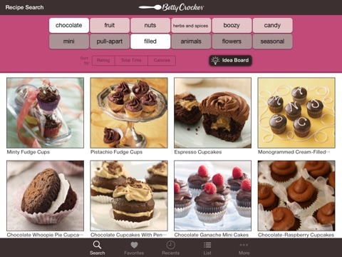 ● Easy search capabilities that let you search by category of cupcakes or by keyword, and an extended idea board that lets you find inspiration by ingredient, type, or a combination