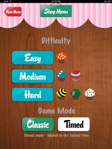 There are 28 custom cupcakes, something for everyone including sprinkles, stars, even a football cupcake. Choose between easy, medium, and hard difficulty levels. Play in Classic mode by matching all the cupcakes on screen or try out the All-New Timed mode where you try to beat the clock and match as many cupcakes as you can while getting bonus time for each succussful match. With a total of 21 cupcakes, 3 levels, and 2 game modes, no two games are ever same. Match all the cupcakes and they will do a dance for you!