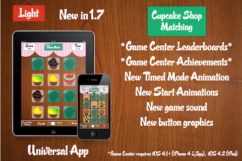 There are 33 custom cupcakes, something for everyone including sprinkles, stars, even a football cupcake. Play in Classic mode by matching all the cupcakes on screen or try out the All-New Timed mode where you try to beat the clock and match as many cupcakes as you can while getting bonus time for each succussful match.