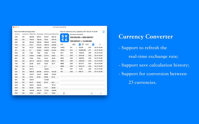 I don’t see a way to add or remove currencies in the list. Also this app does not integrate into the Notification Center in IOS 10.10. Otherwise it’s simplistic, clean and free.