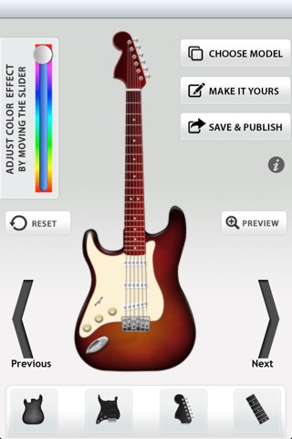 This app gives you the ability to mix and match color body shapes, guitar headstock, strings & much more.