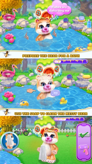 As a professional caretaker you must play this animal game not only for the fun, but also for the wonderful experience you might get when you are trying your best to keep this bear joyful and still with cleaned new clothes. Its actually pretty hard to keep him pleased all the time that is why you should be very careful to fulfill all of his needs when he asks for it. The first thing you need to do is to have fun, the others will join you and everything else will be easier. In the yard you will play with many devices and different toys will come along. When you are done with this part you must take the bear a bath to make him nice and clean. Remove the elements take make him uncomfortable and have a proper washing. Use the shampoo for the hair from the head and put on the soap for the rest of the body. After the cleaning you might also want to dry him in order to be ready for the dressing. Have fun playing with colors and add nice piece of clothing. Try a hat or a nice pair of glasses to match the shoes either the final outfit. Keep things simple, but also try something new in each challenge.