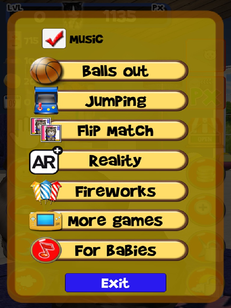 This application has a level suitable for babies and toddlers. At that level there is no advertising or buttons, only the cat-piano and many skins. To return to the beginning, press Back in its central top.