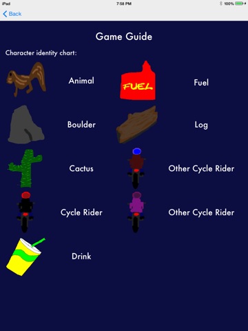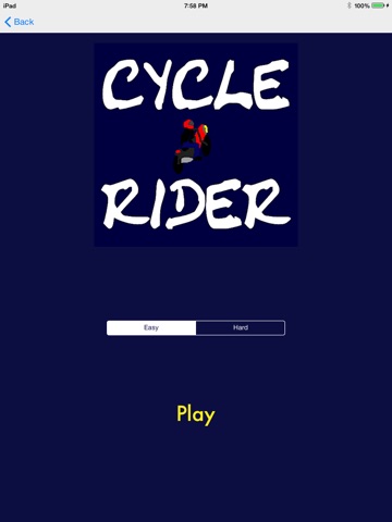 Welcome to the first version of Cycle Rider. The game is easy to learn and has two levels of difficulty. Your cycle is ready to go, look for supplies along the way. The goal of the game is to avoid obstacles, while working toward a high score. Enjoy playing Cycle Rider!