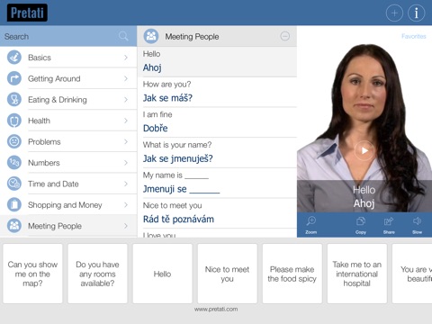 Do you ever wish when traveling that you could have someone who could teach you their local language or even speak it for you when needed? Czech Pretati is truly a unique language translation app utilizing video and voice to help travelers all over the world easily learn and communicate in Czech. Czech Pretati contains over 500 important phrases and words that international travelers will need most when visiting the Czech Republic or when communicating with somone in Czech.