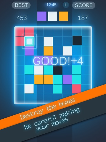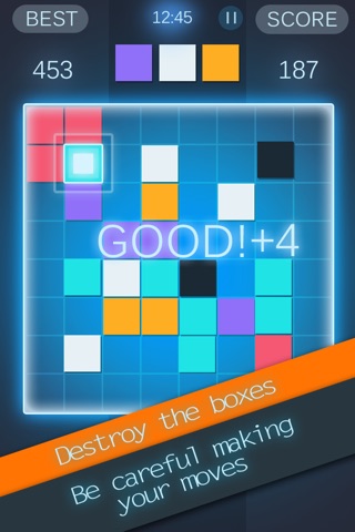 Be careful making your moves, and try to destroy the boxes as much as you can. Or else you will lose the game by filling up all the squares with out destroying them.