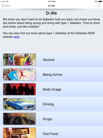 • D-Life: Straight up advice on a range of type 1 diabetes topics that young people want to know about: e.g. diabetes and driving, diabetes and alcohol, diabetes and big nights out.