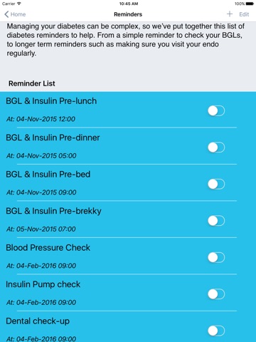 • Reminders: Its sometimes hard to remember the things you need to do to help take care of your diabetes. From BGL and insulin checks four times a day, three-monthly HbA1c tests, to eye tests once a year. Weve put them all together into a simple reminder system.