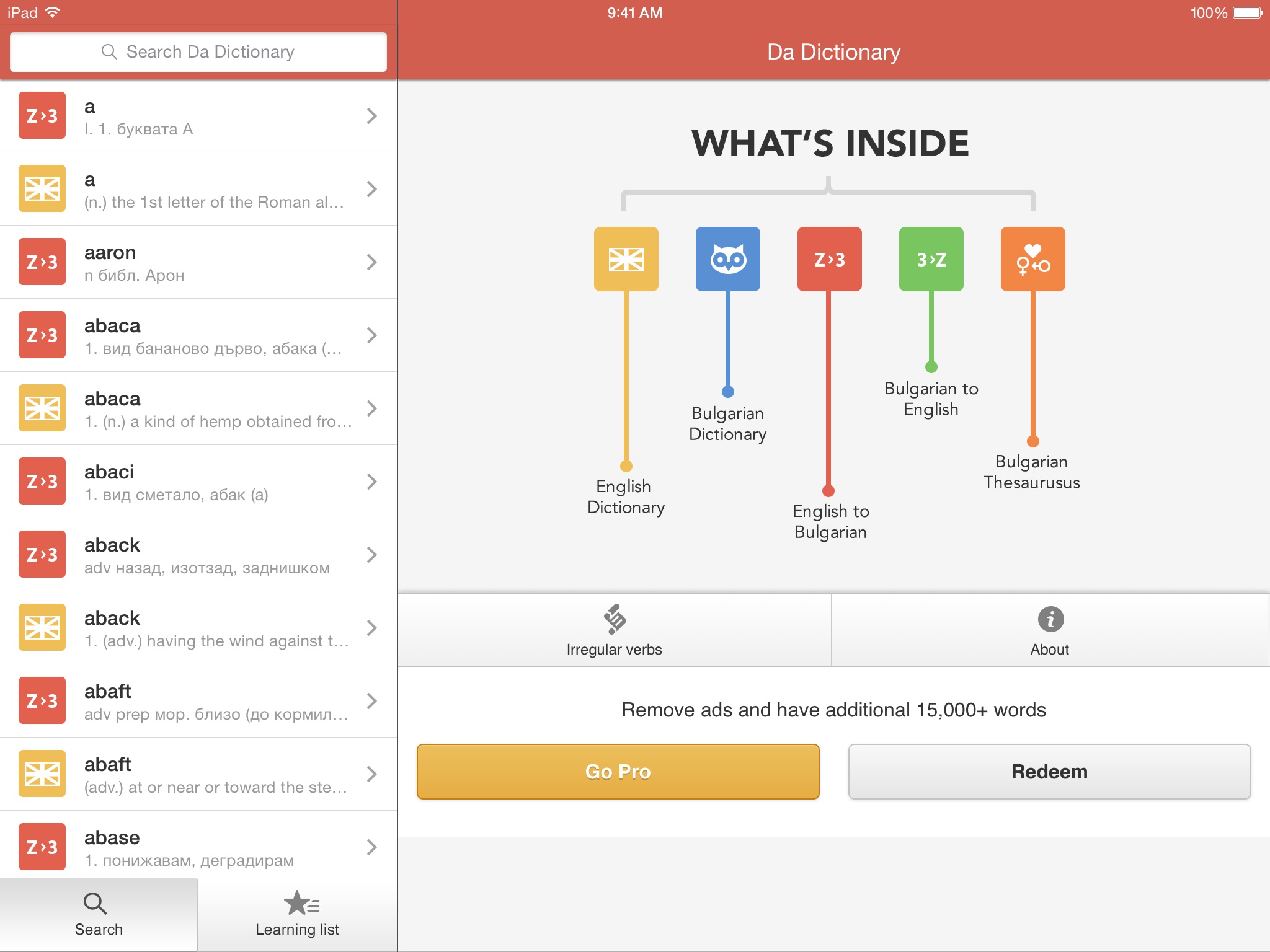 Search in all of them simultaneously. See search results while typing. Listen to English pronunciation. Create and manage your own list of words to learn, and many more cool features!