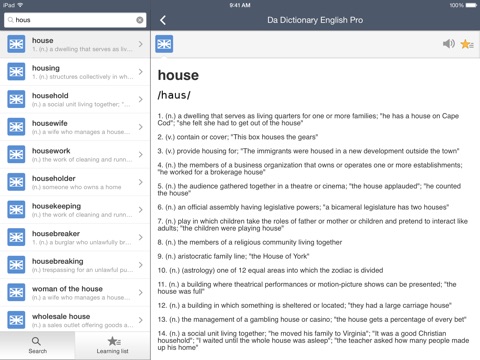 Da Dictionary English Pro is based on WordNet 3.0 by Princeton University, combined with transcriptions. It also features encyclopedic data with information about famous people, buildings and so on. Search results are shown as you type.