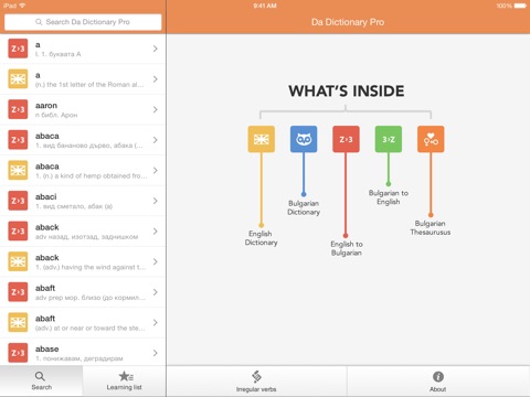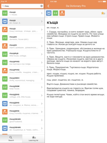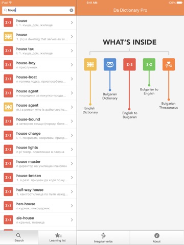 Search in all of them simultaneously. See search results while typing. Listen to English pronunciation. Create and manage your own list of words to learn, and many more cool features!