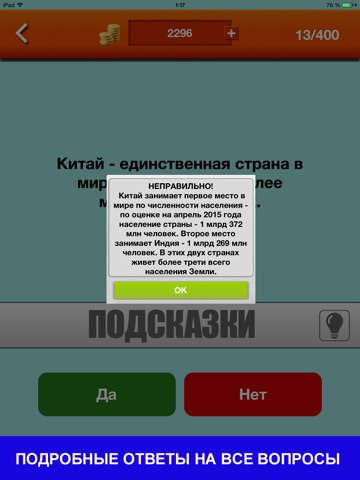 В этой интеллектуальной викторине приведены 400 интересных фактов на разные темы - география, история, наука, искусство, кино, музыка, спорт, литература. религия и др. Вам нужно определить какие из них правильные, а какие нет.
