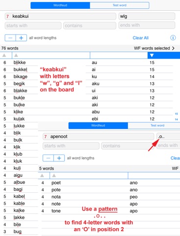 New is the "Test word" option: test if a word exists, and find words with missing letters. You can use this to see if there are words that would fit a game situation, and which letters you would need. Also handy to find 2-letter combinations. Use a single dot for one missing letter, an @ sign for more. Also usable for crossword puzzles.