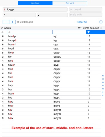 Find words for playing the game, or to learn words you never knew. Sort the results on word length, alphabet, or word score. Find not the longest, but the best word! You can find words using the letters you have, but also match up letters and word parts on the board.