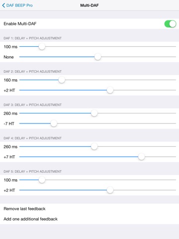 * This version of the app includes the "Multi-DAF" feature. Instead of having just one auditory feedback, you can now have up to 10, each with a different delay and pitch adjustment!
