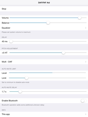 The DAF/FAF Aid implements the methods DAF (Delayed Auditory Feedback) and FAF (Frequency Altered Feedback) that have been shown to significantly reduce stuttering for most people who stutter. The app works by recording the speech through your headset, applying these methods and playing the modified audio back to you.