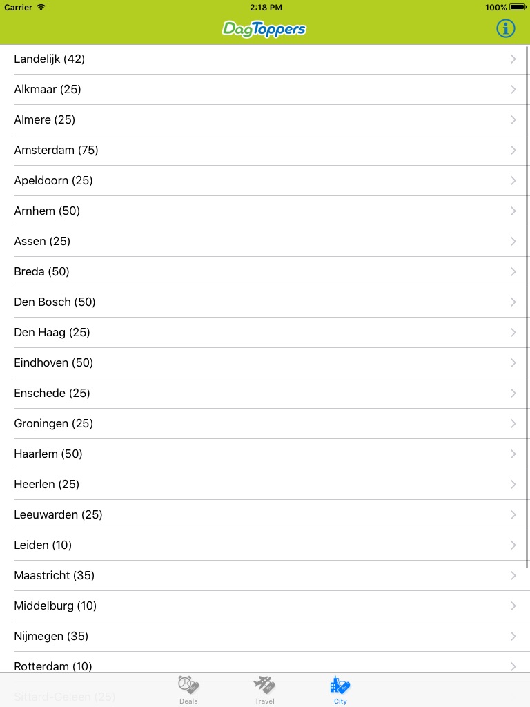 Met DagToppers mis je nooit meer een aanbieding. Bekijk eenvoudig alle Nederlandse dagaanbiedingen en aanbiedingen bij jou in de buurt. Selecteer een stad en zie direct welke kortingen en deals er in de omgeving beschikbaar zijn.