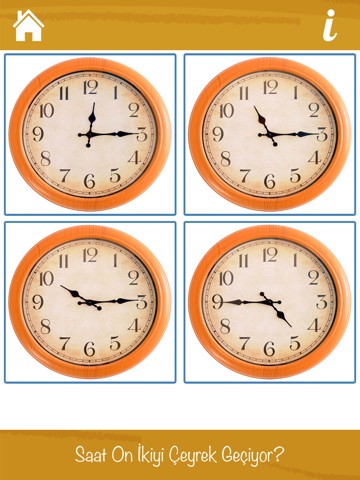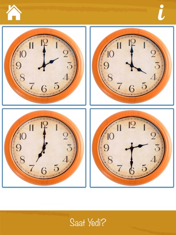 * Oyun bölümünden yer alan ve özenle hazırlanmış sorulara göre dört farklı saatten doğru olanı bulma bölümü oldukça eğlenceli ve eğiticidir.
