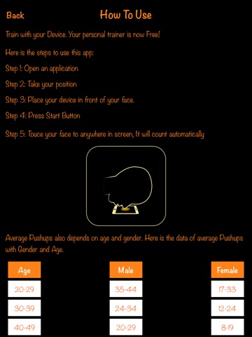 This is a real fitness trainer, It not only helps to count push ups but it also tracks your push up counts daily basis and give you statistics. One main feature which is differ than other app is "Voice Encouragement" !!. Yes, You will get voice encouragement like real trainer !!! Application also has a table of average Push ups which depends on your Age and gender. Take a look this table in Help screen before start. Here is the month-wise display which helps you to know which day you missed to do workout and which day you did.It helps you to maintain consistency in workout.