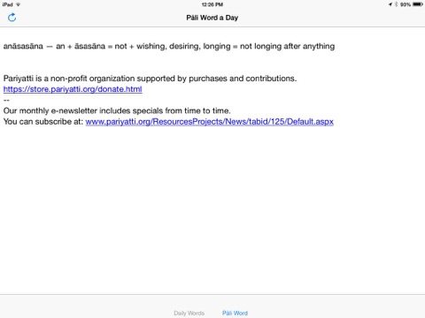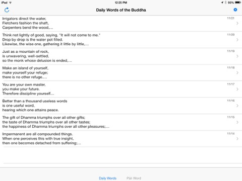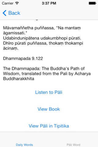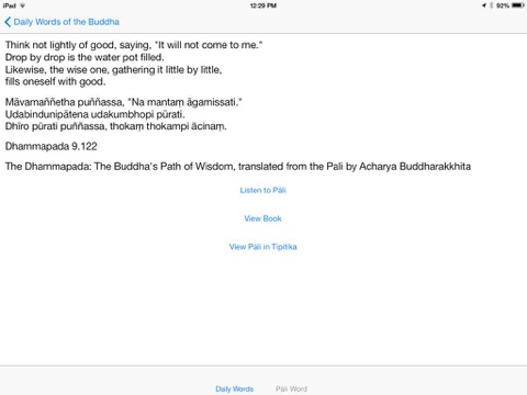 This app provides access to one weeks worth of verses from Pariyattis Daily Words of the Buddha. You can also listen to the Pāli in each verse. Translations of the Pāli verses are available in English, Spanish, French, Italian, Portuguese, Chinese, and Serbo-Croatian.