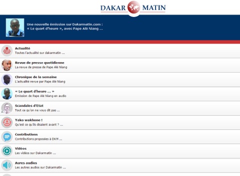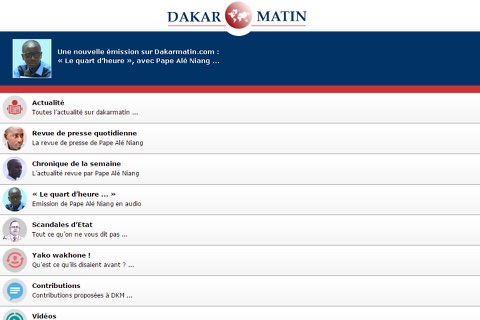 Dakar matin est lapplication du site du même nom Dakarmatin.com, site dinformation sénégalais qui parle de lactualité nationale et internationale. Il se différencie des autres sites de la même catégorie de par son contenu sérieux et original notamment avec sa propre revue de presse faite par le célèbre journaliste Pape Alé Niang pionnier des revues de presse à la radio, qui y présente aussi des émissions en audio comme le "Quart dheure".