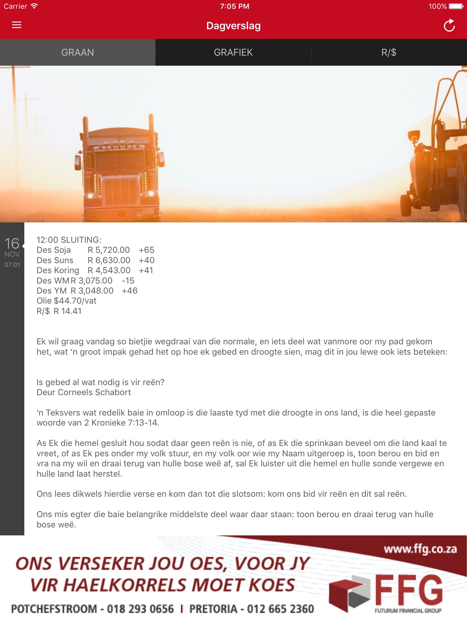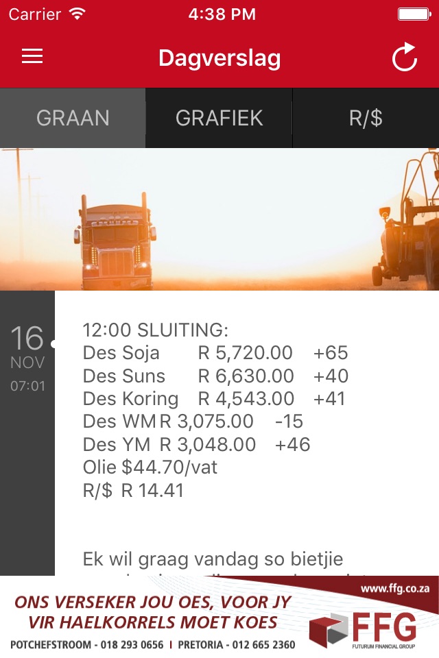 An agricultural information app specifically catering for South Africans. Including data from the SA and US Grain Markets. With free live price updates from the JSE! Live feeds of the USD/ZAR exchange rate and US Dollar prices of CBOT crops.