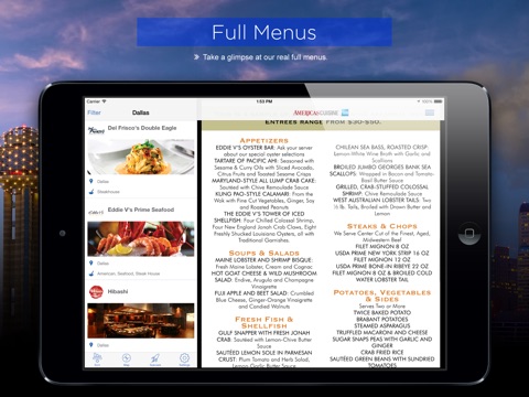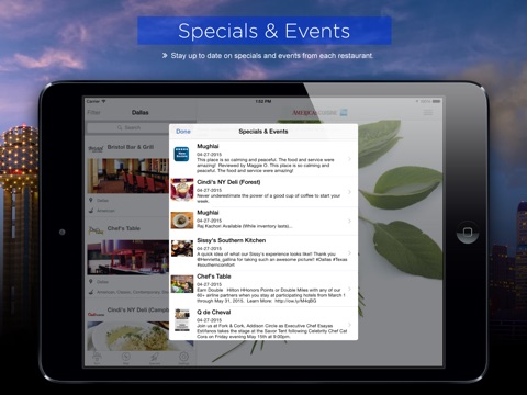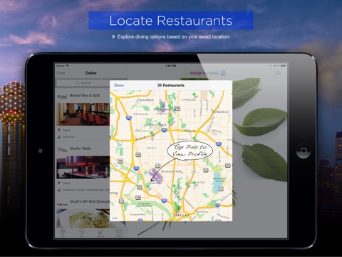 Every restaurant listing includes menus, photos, restaurant amenities, reservation capabilities and GPS directions to help mobile diners find the best meal in the city. Using advanced search options, pick your restaurant by name, location, cuisine type or meals served with the search option. The Dallas Dining App is supported by AmericasCuisine.com, a Nationwide Dining Guide that diners and travelers have learned to trust over the past 20 years.