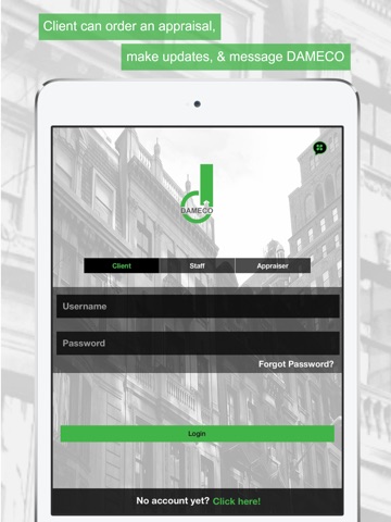 Clients can quickly order appraisals, receive real-time notifications when there is an update, view their entire order list and details, exchange messages with DAMECO staff, upload documents to their order, view or download appraisal reports, and update an order’s status if it needs to be placed on hold, canceled, or requires revisions.