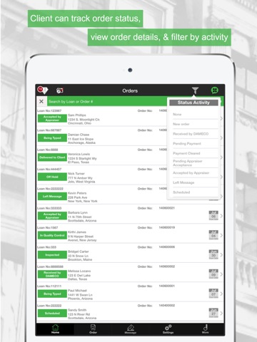 Appraisers can accept or decline new orders, update an order status, enter inspection and estimated completion dates, map the subject’s location, call or email the borrower directly from order details, and view complete order information while out in the field. They receive notifications when a new order is assigned, when there is a new message from DAMECO and when payment for an appraisal is sent.