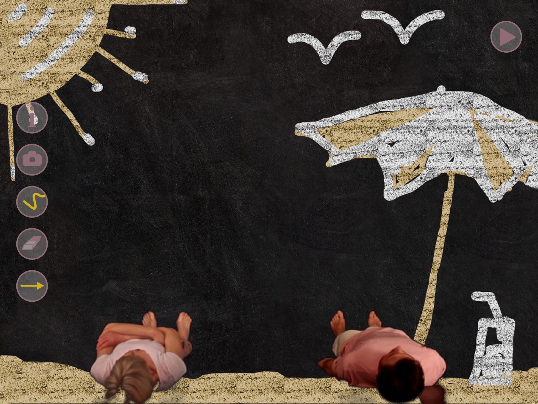 In the second part of this scene, there are six different moves for each dancer - try different combinations to choreograph your dancers. Swipe left, right, up and down all get different results. Also try tickling them with two fingers. And of course you can continue chalking! The erase tool is different in this scene, more like a traditional paint app. Note: When you chalk in this scene the dancers roll off and back on to give you a clean page to draw on.