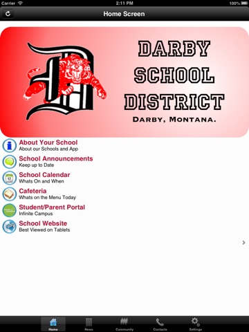 This app is for the community of Darby Schools, Montana. It allows easy access for often sought information such as the school calendar, the cafeteria menu and the school newsletter. Users can subscribe to various notifications including sporting and after school clubs. The school can keep the community up to date via push notifications.